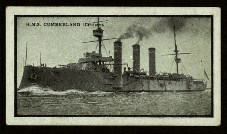 An item dated London 1 October reported that the British Admiralty announced the capture by the cruiser HMS Cumberland (1) of eight steamships belonging to the steam shipping line of the Woermann Linie (2)and Arnfield of the Hamburg-Amerika Linien with a total tonnage of 30,915 tons and the gunboat Soden (3) at the Cameroon-river.(4) It was expected that the scuttled floating dock and the Herzogin Elisabeth could be salvaged.