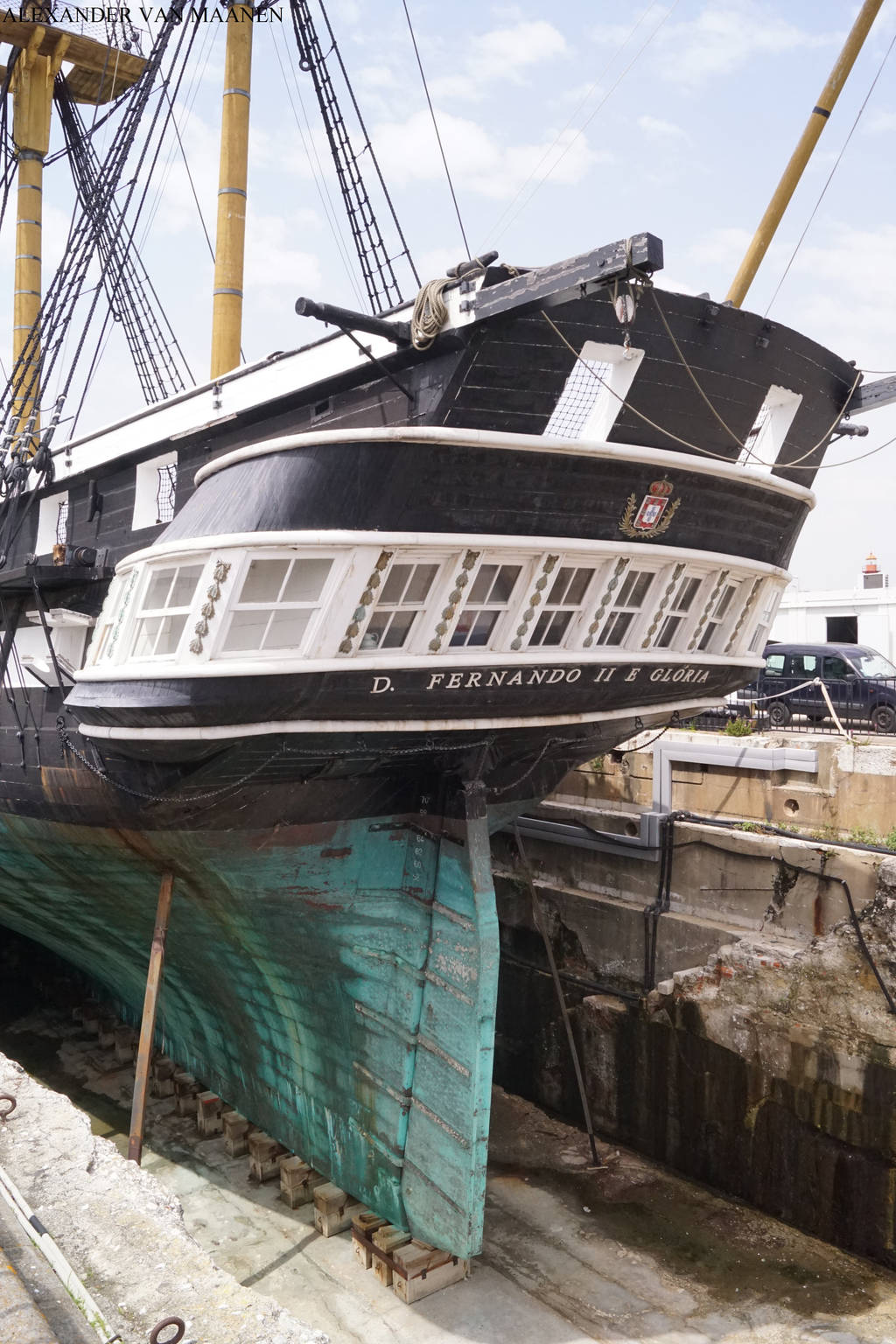 Ordered to be built in 1824 although not earlier launched as on 22 October 1843 at the Royal Naval Arsenal, Damão, Portuguese India and departed on 2 February 1845 Goa arriving on 4th July at Lisbon, Portugal. Burned on 3 April 1963 and what was left was towed to a place along the Tagus to prevent that the shipping was disturbed. The wreck was on 22 January 1992 brought to the Arsenal of Alfeite and in 1992 to the Ria-Marine shipyards at Aveiro and there restored. On 27 April reinstalled in the navy as an auxiliary ship and the same year handed over to the Naval Museum.