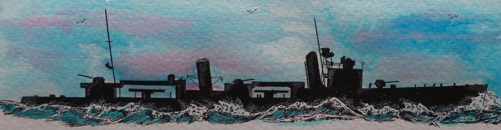 General specifications. Of the Navigatore-class, succeeded by Turbine-class and succeeded by Freccia-class, developed as an answer on the French Jaguar and Guépard-classes. With a displacement of 2.125 (standard)-2.599 (normal)-2.830 (full load) tons and as dimensions 107.28 x 10.2 x 3.4 metres or 352.0 x 33.6 x 11.2 feet. Her machinery consisted of 2 geared steam turbines and 4 water tube boilers supplied via 2 shafts 55.000 hp allowing a speed of 38 knots and a range of 800 respectively 3.800 nautical miles with a speed of 38 respctively 15 knots. Crew numbered 173 (including 9 officers)-225 men. Armament consisted of 3x2-12cm/4.7” guns, 2x1-4cm/1.6” anti aircraft guns. 4x2-13.2mm/0.52” machine guns and 2x3-53.3cm/21” torpedo tubes and 54 mines and 14 depth charges.