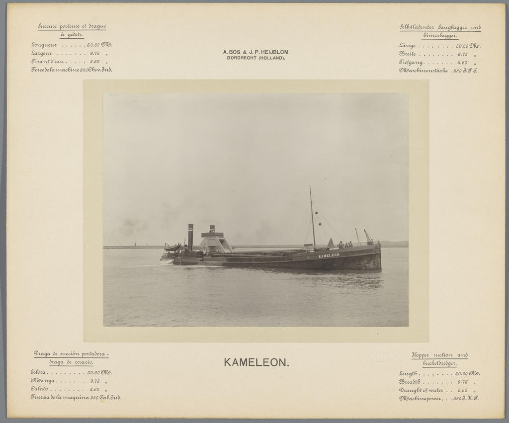 Dimensions 50.60 x 9.75 x 360 metres, measured 500 ton and 280 ihp horsepower. Built by Scheepswerf J.&K. Smit with yard number 404 in 1886 for Adriaan Volker, managaed by A. Volker Lz.&P.A. Bos. Was in 1912 involved in an accident. The Dutch newspaper Rotterdamsch nieuwsblad dated 6 February 1912 published an item dated Lisbon, Portugal 2 February that the wood planking on both her sides was torn off and the engines damaged. She was underway from Antwerp, Belgium to Buenos Aires, Argentina departing from Lisbon as the G.G.1 (Gebroeders Goedhardt 1). The edition dated 23 March reported that she stranded 70 miles of Jaragua and was abandoned. More or less was she suggested that she was a former Dutch (?) gunboat converted into a dredger. Uncertain if this Kameleon is similar to the one built in 1886.