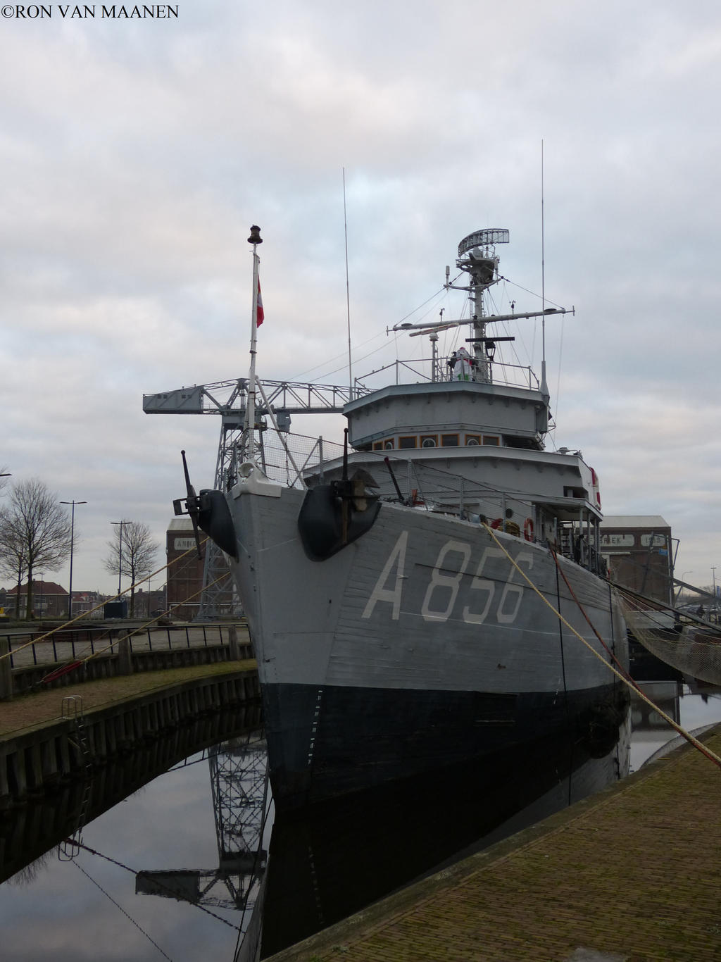 Laid down at the shipyard of the Peterson Builders Incorporation, Sturgeon Bay, Wisconsin, USA on 19 February 1952, launched on 17 January 1953 and commissioned on 22 July 1953 as Hr. Ms. Onverschrokken (M886). She and her sister ships were built in the USA and handed over to the Netherlands according to the Mutual Defense Assistance Program. Since 1 January 1969 classified as headquarters-support ship for minesweepers squadrons. Since 1970 was she no longer used as a minesweeper and was in 1972 rebuilt as a torpedo work ship and at the same time renamed Mercuur. All torpedo works ships serving in the Royal Netherlands Navy since the 1880’s are named Mercuur. She assisted at torpedo launching tests executed by submarines by afterwards picking up the torpedo and taken at board preparing for the next test launching. Further more served she as target during torpedo tests. In 1987 replaced by the Mercuur (A900) built by Damen Schelde Naval Shipbuilding. Temporarily handed over to the Stichting Nautisch Kwartier Amsterdam, however given back to the Royal Netherlands Navy after some time. Then handed over to the Stichting Behoud Maritieme Monumenten and became a museum ship since 1992 at Scheveningen, Netherlands until December 2015 when she was towed back to Den Helder, Netherlands after she was given back to the Royal Netherlands Navy on 15 December. Her final fate was to be broken up there. The Stichting Maritiem Erfgoed Vlissingen succeeded in 2016 to persuade the Royal Netherlands Navy to save her for the time necessary to develop a business-plan as museum ship. On Saturday 16 December 2016 arrived she partly stripped in Vlissingen-Oost. There is the asbestos to be removed and started with the maintenance and conversion again into a museum ship. In the second half of 2017 towed to the town of Vlissingen. Displacement 790 tons and as dimensions 55,00 x 10,70 x 3,70 metres. Original diesel motors supplying 1.600 hp allowing via 2 screws a speed of 15,5 knots. Her crew numbered 67 men. The armament consisted of 1-4cm machine gun.