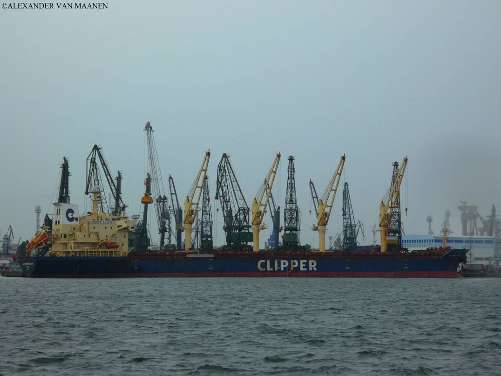 Marshall Islands-flagged, IMO 9406075, MMSI 538007581 and call sign V7G4. Earlier Bahamas-flagged, homeport Nassau, MMSI 311016300 and call sign C6YD2? Built by Tsuji Heavy Industries Jinagsu, Zhangjiagang, China in 2009. Owner Clipper Bulk, manager Clipper Fleet Management, Copenhagen, Denmark.