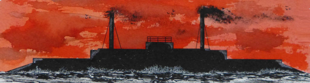 In the magazine The Artisan dated 1 July 1868 was a plate with figures and a small note published dealing with several designs for a ‘circular warship’ proposed by John Elder. He believed that such a ship with a widened beam could have a thicker and heavier armour and heavy guns compared with a ship of the common design and at the other hand a shallower draught and with a somewhat increased horsepower a comparable speed. The same year he read his paper Circular Ships of War, with immersed motive power for the United Service Institute in London, England. He executed eperiments with his own construction and the common construction principles [the latter of a modern ironclad] including in all sorts of weather. It resulted in a draught around one-half of the draught of a common vessel allowing it to act in waters yet unaccessible. The power of rotation made it possible to act as a floating revolting turret or as a ram [like a gigantic circular saw).
