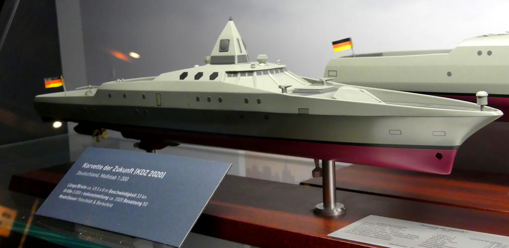 Model made by Ihlenfeldt&Berkefeld 1:200 made September 2001. Displacement 2,000 tons and as dimensions around 86.00 (waterline)-94.00 (over all) x 13.50 (waterline)-15.00 (H-deck)-16.80 (maximum) metres. Speed 33 knots. Crew beneath 50 men. Sea endurance more as 60 days. To be commissioned around 2020.