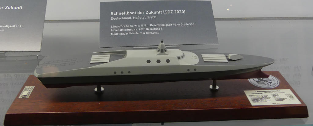 Model made by Ihlenfeldt&Berkefeld 1:200 dated February 2020. Displacement about 350 tons, dimensions around 46.50 (waterline)-49.50 (over all) x 7.20 (waterline)-8.00 (maximum) metres, crew maximum 8 men, speed 40 knots minimum and sea endureance aroudn 5 days.