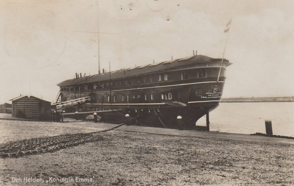 Also called frigate, call sign GQMF, on stocks as De Ruyter at the naval yard at Amsterdam, Netherlands on 6 November 1876, completed for the half on 31 October 1876, renamed Koningin Emma der Nederlanden on 7 January 1879, launched on 20 January 1879, commissioned on 1 December 1881, decommissioned on 22 May 1896 for repairs, commissioned on 16 June 1897, decommissioned on 23 June 1900, converted at the shipyard De Lastdrager at Den Helder, Netherlands into an accommodation ship in 1908, commissioned on 16 November 1908, guard ship at Willemsoord, Netherlands in 1920, captured by the German forces at Willemsoord on 14 May 1940, capsized and sunk at Den Helder in 1942, salvaged in April 1943 and scuttled north of Fort Harssens. Displacement 3.160 ton and as dimensions 80,00-91,85 x 12,50 x 6,10 metres, horsepower 2.732hp/450 nhp, speed 14,10 miles, one double bladed screw with a diameter of 4,88 metres, sail area 1.585 square metres, coal bunker capacity 325 ton for 5ive days full speed, iron built wood planked although the hull above the waterline and some other parts were made of steel to be able to increase the ammunition and coal bunker capacity, her crew numbered 200 men and the armament consisted of 6-17cm guns and 4-12cm guns. The engines and boilers were manufactured by the Koninklijke Fabriek van Stoom- en andere werktuigen at Amsterdam, Netherlands.