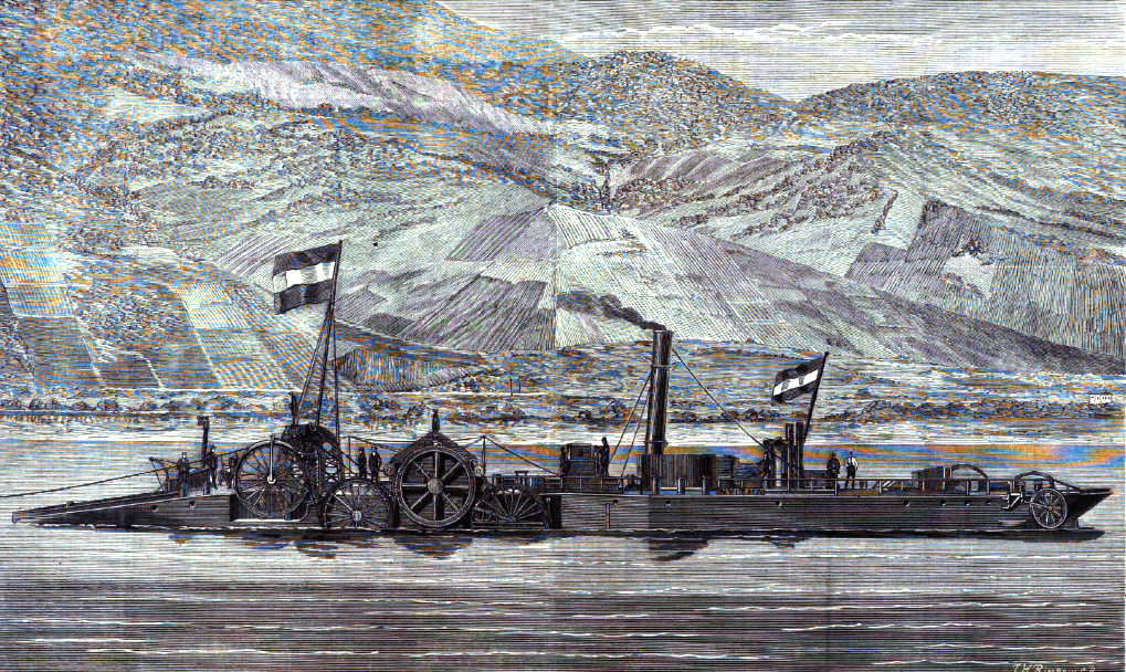 Built for account of the Imperial Danube Steam Navigation Company for service on the Danube using the wire-rope towage method using Fowler‘s clip-drum. Designed by managing director of the Central Towing Company, Cologne, Germany Mr. T. Schwarz. Flat-bottomed with 2 false keels. Iron-built. At the bow and stern fitted out with a large rudder separately controlled by a wheel near the centre of the boat. Dimensions 138 x 24.5 x7.5 (hold) x 3.9feet. Displacement around 200 tons. In second half of 1871 executing towage trials. Weight machinery 42 ton, boilers 32 ton and coal bunker capacity 10 ton.