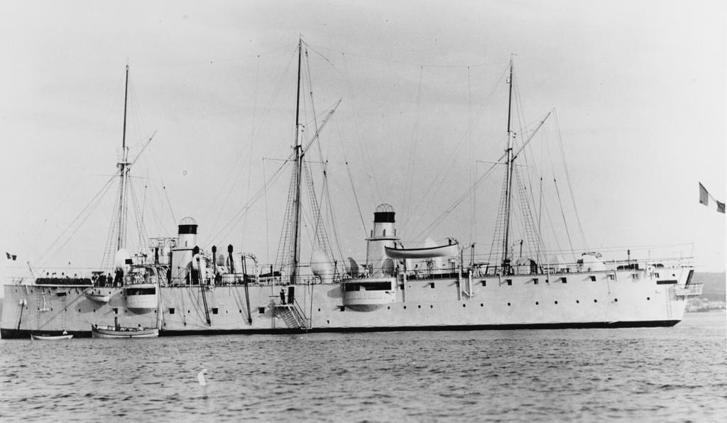 1. Of the Destrées-class protected cruisers, laid down by Forget et Chantiers de la Gironde, France in December 1896, launched on 7 September 1899, completed in 1900 and wrecked in 1910. Displacement 2.467 tons, armament 2x1-13,8cm/5.4” guns, 4x1-10cm/3.9” guns, 8-4,7cm/1.9” guns and 2-3,7cm/1.5” guns and Speed 20-20,5 knots.The newspaper Het nieuws van den dag voor Nederlandsch-Indië dated 22 April 1902 reported that sailors of her helped the Germans at Dar-es-Salaam, German East Africa extinguishing a forest fire which became a threat for the local gun powder magazine. The edition dated 30 November 1910 reported that she for 196.144 francs was sold to a shipyard at Stettin, Germany.