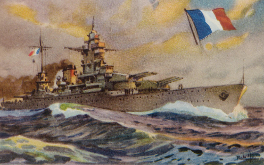 1. Of the Dunkerque-class fast battleships, preceded by planned Lyon-class and realized Bretagne-class, succeeded by Richelieu-class. Designed first as an answer on the fast Italian heavy cruisers, later on the German Deutschland-class heavy cruisers nicknamed pocket battleships. Laid down at the navy yard at Brest, France on 24 December 1932, launched on 2 October 1935, commissioned on 1 May 1937, scuttled at Toulon, France on 27 November 1942 and finally broken up in 1958. Displacement 26.900/26.500 long tons (standard)-35.500 tons/34.900 tons (full load), a main armament of 8-33cm/13” guns and a maximum speed of 31,06 knots.