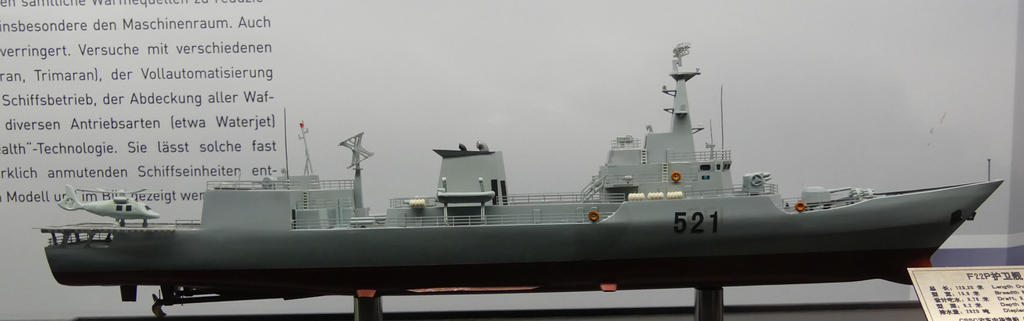 Ship yard model 1:250. Made by Hudong-Zhonghua Shipbuilding (Group). Displacement 2,820 tons and as dimensions 123.20 (over all) x 13,8 (moulded) x 8.2 (depth moulded) x 3,76 metres. Speed 29 knots, range 4,000 nautical miles/18 knots. Crew numbers 202 men. Armamement 8 C-802 launchers, 8 ship-air missiles HQ 7, 1-76cm gun, 2-3cm guns and 6 submerged torpedo tubes.