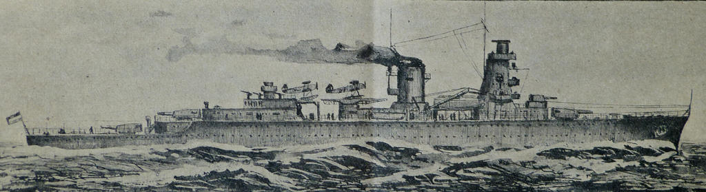Several 1930s editions of the Brassey’s Naval Annual published a sketch of the Dutch light cruiser Celebes then under construction at Rotterdam, Netherlands. The following details were supplied: tonnage 5,900 tons, an extreme length of 560 feet, 32 knots speed and an armament of 3x2-5.9”, 4-4.2” anti aicraft guns, 4 machine guns and for launchinhg the 2 seaplanes a catapult. There was a light cruiser between 1933-1936 under construction by Wilton-Fijenoord, Schiedam but this was the Hr.Ms. De Ruyter, flagship of rear admiral Karel Doorman in the disastrous sea battle in the Java Sea. The Celebes design was in fact the De Ruyter but the final design of the latter was improved including adding a 7th gun. Her technical characteristics were 6,545 (standard)-7,669 (full load) tons and as dimensions 170.9 x 15.7 x 5.1 metres or 560.8 x 51.6 x 16.9 feet. Armament 3x1&1x1-15cm/5.9” guns, 5x2-4cm/1.57” Bofors anti aircraft guns and 8x12.7mm/0.50” Browning machine guns. The De Ruyter was preceded by the Java-class light cruisers of which the Java and Sumatra were completed, the third unit was named Celebes of 6,670-8,078 (full loaded) tons was laid down by Wilton-Fijenoord on 14 June 1917but 1919 cancelled and broken up.