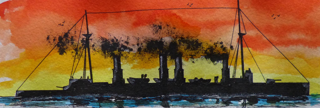 Displacement 15,250 tons and as dimensions 492 x 75.5 x 25/5 feet. Propulsion consisted of Parsons turbines allowing with 36,000 hp a speed of 24 knots. The armament consists of 20-45.72m/18” torpedo tubes below the waterline for which 60 torpedoes were carried and 20-11.9cm/4.7” guns in small turrets and 2 in casemates forward in the bow. Along the waterline amidships was a 30.48cm/12” thick belt tapering forward and aft to 5.08cm/2” and further more a by 5.08cm/2” protected conning-tower forward. Estimated building costs 1,500,000 pond sterling.
