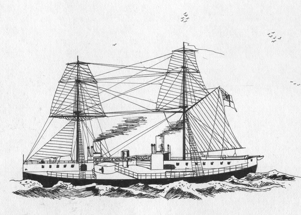 Designed by the Department of the Controller of the Navy and engined by Messrs. J. Elder&Co., Glasgow, Scotland. Designer chief constructor of the Royal Navy (1885-1902) Sir William White (2 Feburary 1845 Plymouth)-27 February 1913 London). Laid down by Portsmouth Dockyard on 24 Feburary 1874, launched on 27 April 1876, commissioned on 5 July 1881, Portsmouth guard ship until 1897, Fleet reserve after 1897, Dockyard Reserve since April 1902 sold to be broken up in 1903.