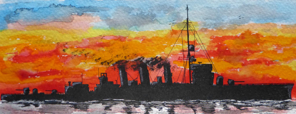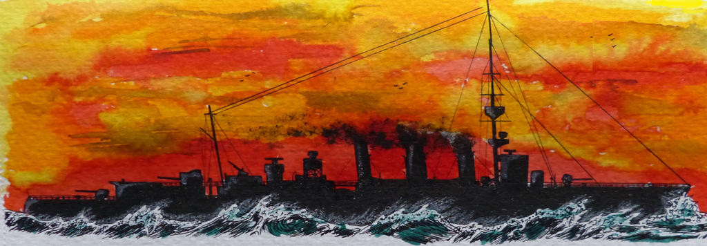 British Arethusa-class light cruisers, preceded by Active-class, succeeded by C-class. Consisted of Arethusa, Aurora, Galatea, Inconstant, Penelope, Phaeton, Royalist and Undaunted. Laid down by Vickers Limited on 12 March 1913, launched on 21 October 1914, commissioned in Feburary 1915 and sold to be broken upon 16 January 1923. Main armament 2x1-15.2cm/6” BL Mk XII guns mounted on the centreline fore and aft of the superstructure and 6x1-10.2cm/4” Mk V quick firing guns.