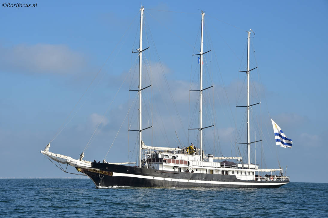 Uruguay-flagged, homeport Montevideo, MMSI 770576100 and call sign CWBE. Three-mast staysail schooner. Ordered to be built in January 1930. Laid down by Sociedad Española de Construcción Naval shipyard Cádiz, Spain on 3 March 1930, launched on 27 July 1930, commissioned as survey vessel in 1930, served until 1976, was to be broken up but converted into a training ship in 1978.
