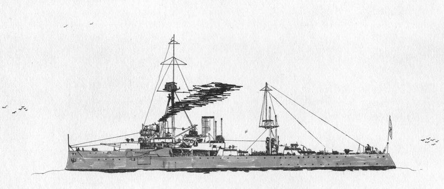 3. Ordered in 1905, laid down by HM Dockyard Portsmouth on 2 October 1905, launched on 10 February 1906, commissioned on 2 December 1906, decommissioned in February 1919 and sold to be broken up on 9 May 1921. Preceded by the Lord Nelson-class and succeeded by the Bellerophon-class. Her main armament consisted of 5x2-30,5cm/12” guns to which 27x1-7,6cm/3” guns and 5-45cm/18” torpedo tubes were added. Speed 21 knots.